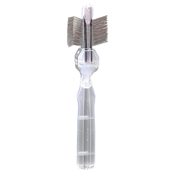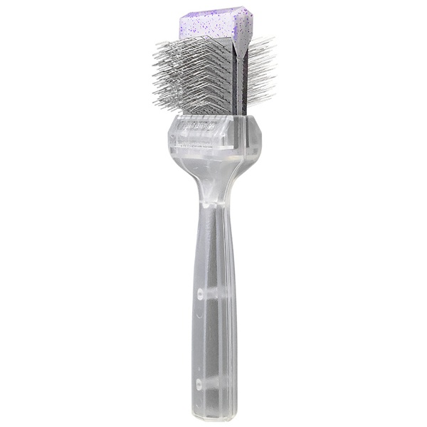 ActiVet Diamond Daily Care flexkarda med lila glitter är en dubbelsidig flexkarda med två fasta sidor. Den ena sidan har böjda stift som reder ut tovor och eliminerar lösa pälsstrån. Den andra sidan har raka stift och fungerar både som finishing-karda för en jämn finish, och som träningskarda för hundar och katter som behöver vänja sig vid att bli borstade.