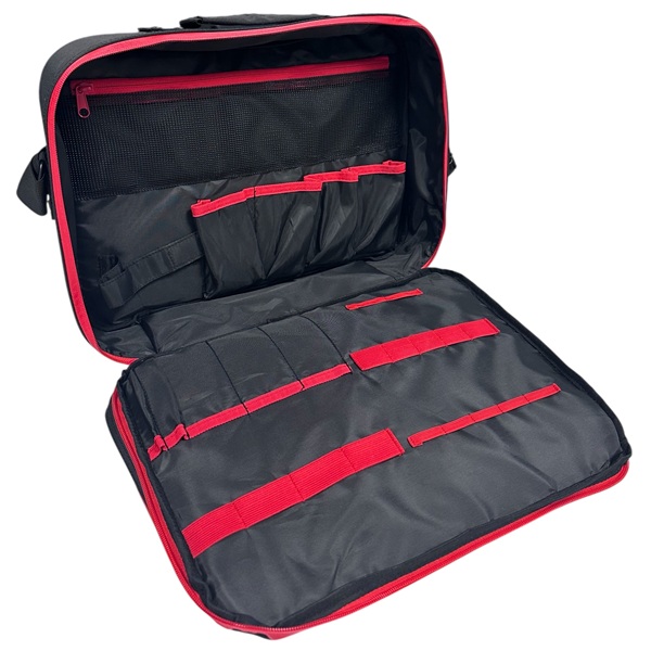 Väskans insida har många mindre fack samt resårband för att hålla verktygen på plats. På väskans framsida finns ett separat specialfack för 14 saxar. Det ryms 7 saxar per sida och mellanlägget i nät skyddar saxarna när facket är stängt.
