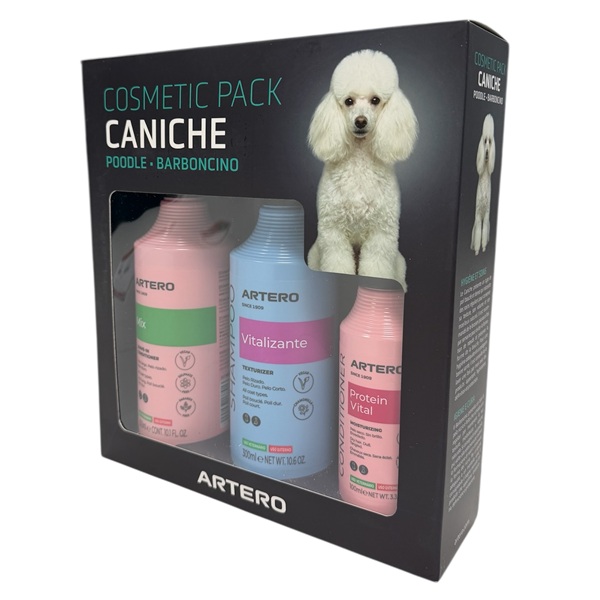 Komplett pälsvårdsset med högkvalitativa produkter för pudel eller andra hundraser med liknande päls. Förpackningen innehåller Vitalizante hundschampo, Protein Vital hundbalsam samt Artero Mix balsamspray.