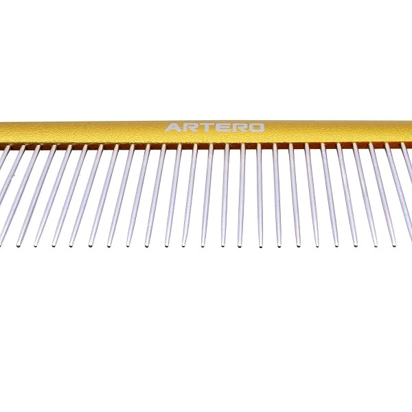 Artero Giant Gold är en exklusiv hundkam med glesa tänder, utmärkt till långa, medellånga, lockiga eller täta pälsar. Kammen används för att kamma ut pälsen, fluffa upp eller lyfta den vid klippning.