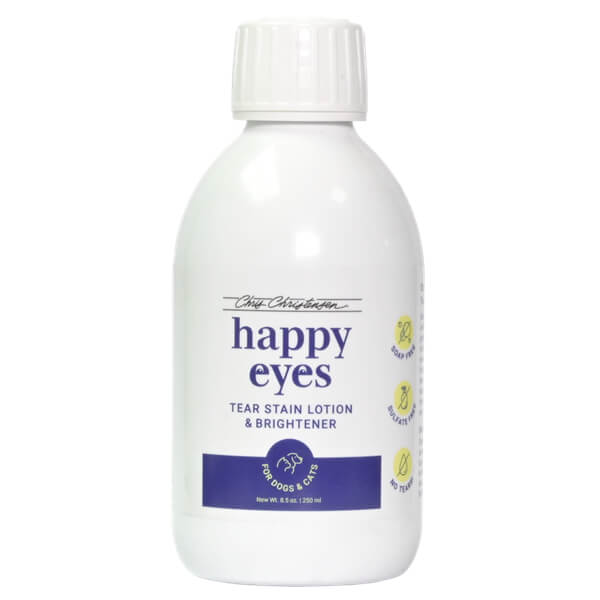 Chris Christensen Happy Eyes Tear stain lotion är en skonsam och effektiv ögonrengöring. Happy Eyes hjälper till att ta bort och förebygga missfärgningar under ögon och i ögonvrån. Den milda formulan förebygger irritation i ögonen och tar bort damm och smuts som fastnat i tårresterna. Fungerar till alla pälstyper och även till valpar och hundar med känslig hud.