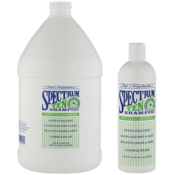 Chris Christensen Spectrum Ten är ett hundschampo speciellt framtaget för mjuka, vågiga eller silkiga pälsar. Redan efter första användningen märker du skillnad. Hundens päls blir mjuk, vackert glansig och mer lätthanterlig. Schampot fungerar även till katt.