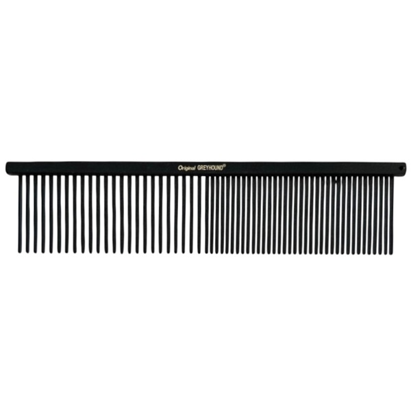 Kammen har två sidor, en med täta tänder och en med glesa tänder. Greyhound-kammen är välbalanserad och har en handslipad rygg som gör att den ligger bekvämt i din hand.