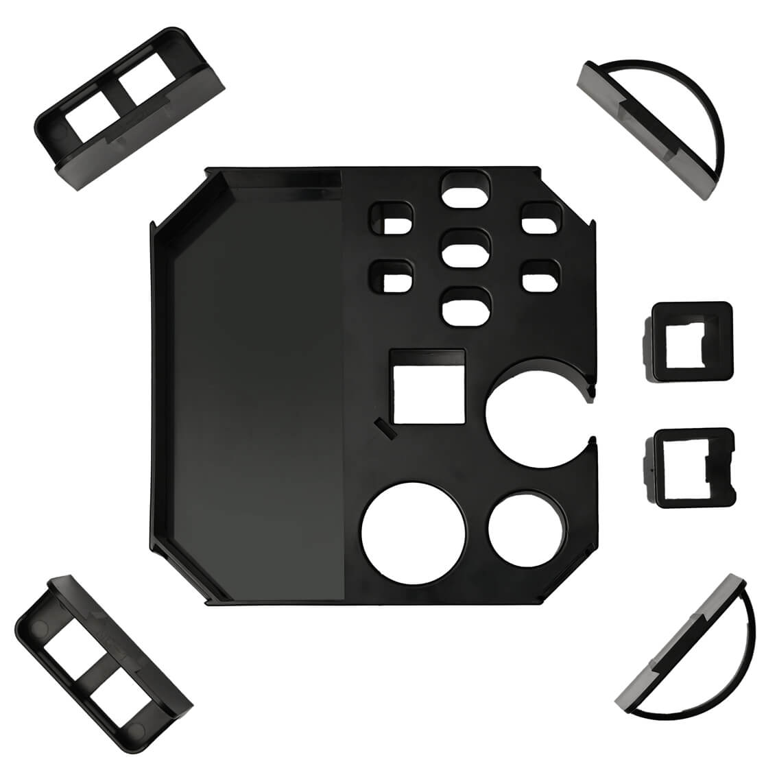 Hållaren har plats för flera saxar eller trimverktyg i de mindre hålen. Den större öppna ytan mäter 18,5x8 cm och har plats för exempelvis kammar, kalk, fingerkondomer eller snoddar. Två hål för trimmers finns (diameter ca 4,5 cm) samt ett mindre hål (diameter ca 3,5 cm). Två hörnenheter för borstar samt två för exempelvis kloverktyg eller mindre borstar ger ännu mer förvaring.