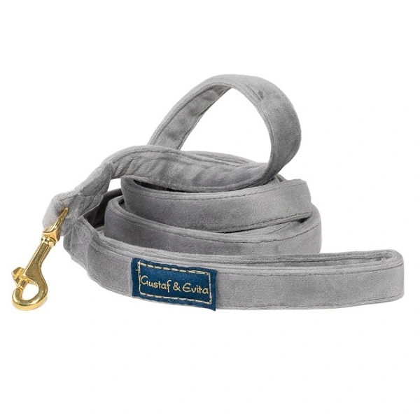 Elegant och lyxigt hundkoppel tillverkat i supermjuk grå sammetspolyester. Mycket mjukt och behagligt att hålla i. Kopplet är 180 cm långt och har mässingshake.