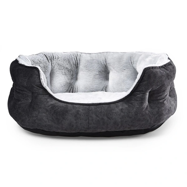 Snygg och stilren, oval hundsäng med höga kanter. Hundbädden har mörkgrått yttertyg med lyxig sammetskänsla. Insidan och den fasta dynan är klädda med supermjuk, silvergrå plysch på mörk botten. Bäddens höga kanter gör hundens sovstund extra trygg och mysig.
