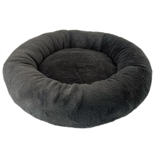 Mjuk och fluffig hundsäng i mörkgrå plysch, perfekt för god sömn och avkoppling. En mysig och bekväm bädd för den lilla hunden eller katten.