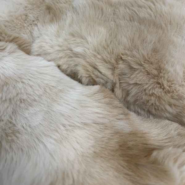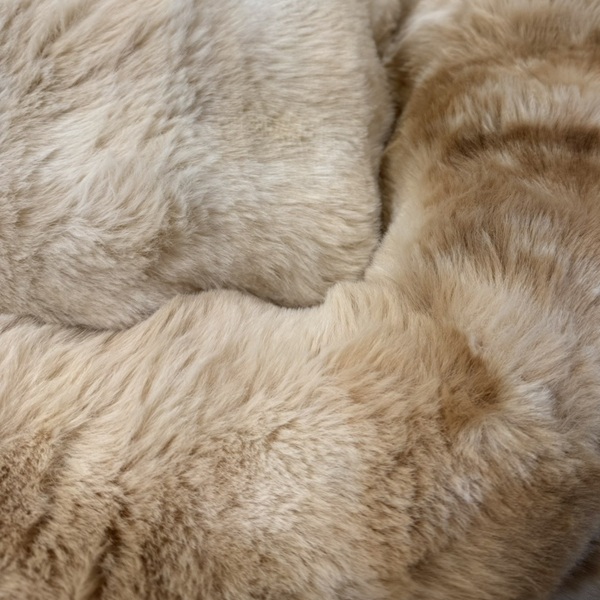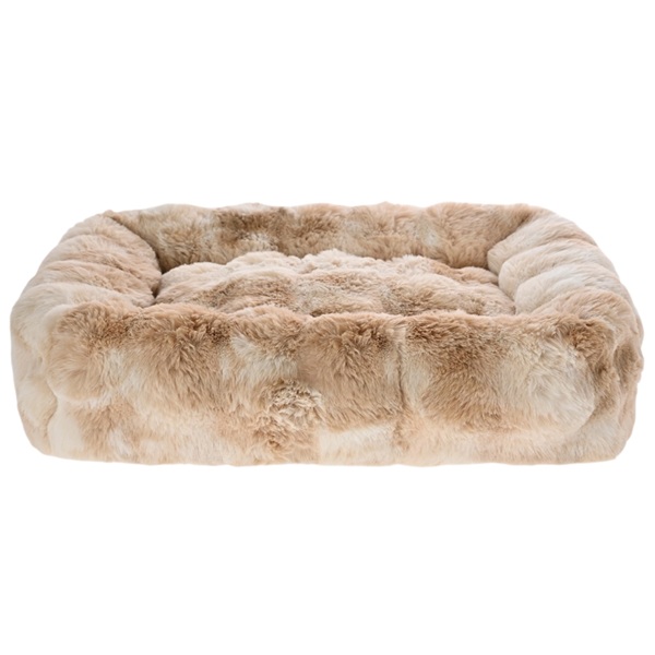 Lyxig, mycket välstoppad hundbädd i supermjuk plysch. Det lurviga plyschtyget är vackert melerat i beige och ljusbruna nyanser.