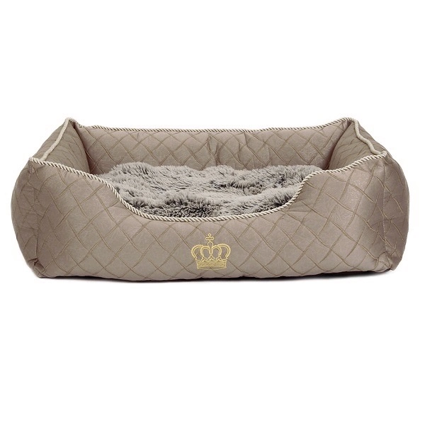 Elegant hundbädd i quiltat tyg. Hundsängen har vändbar dyna. Ena sidan är klädd med mjukt, lyxigt pälstyg och andra sidan med samma quiltade tyg som bädden. Pälstyget har svart botten och ljusa toppar. Bädden är kantad med brokadband och har broderad krona framtill. Perfekt för sömn och avkoppling.