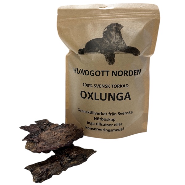 Torkad lunga av svensk nötboskap. Ett proteinrikt hundgodis utan tillsatser eller konserveringsmedel.