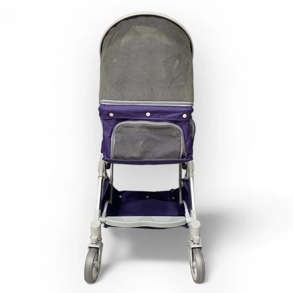 Hundvagnen är försedd med flera ventilationsnät. Burdelen stängs med dragkedja och suffletten kan fällas upp och fästas fast i öppet läge.