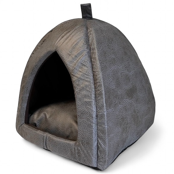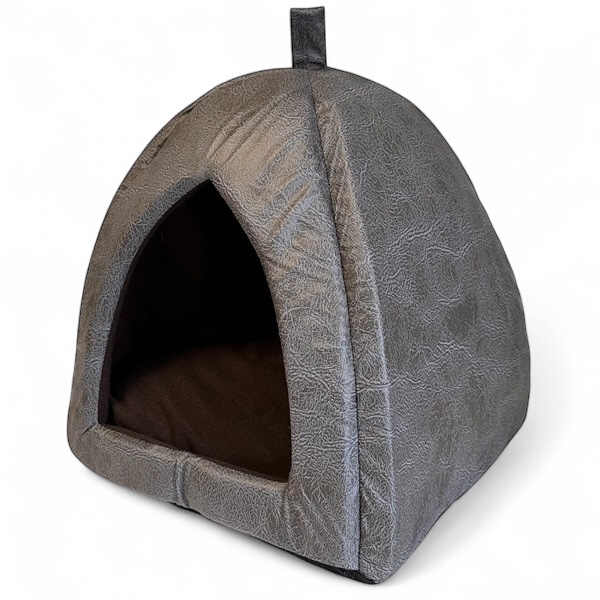 Fin sovplats för den lilla hunden eller katten. Ett mysigt krypin för ro och avkoppling. Igloon är tillverkad i brunmelerat konstläder. Vändbar kudde med brunt tyg på ena sidan och konstläder på den andra. Undersida med antiglid-noppor.