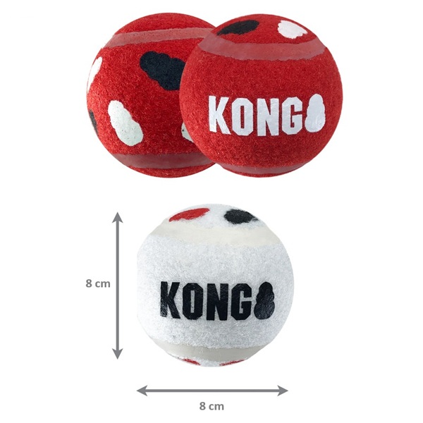 KONG Signature Sports Balls är specialgjorda tennisbollsliknande bollar som är perfekta för roliga kastlekar med din hund. Bollarnas extra tjocka gummiväggar gör att de håller längre och att de studsar på ett extra spännande sätt. För att vara så skonsamma som möjligt för tänder och tandkött täcks bollarna av ett icke-slipande filtmaterial.