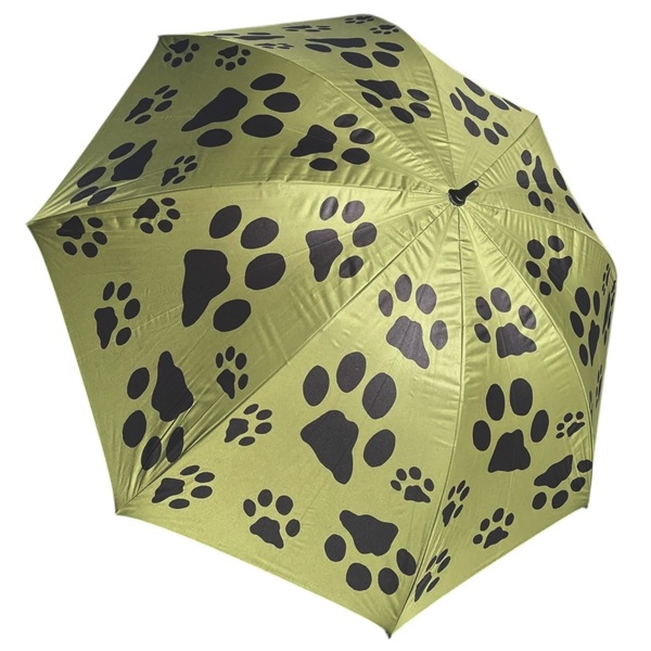 Stort och rejält paraply, fint mönstrat med svarta tassar på olivgrön botten.