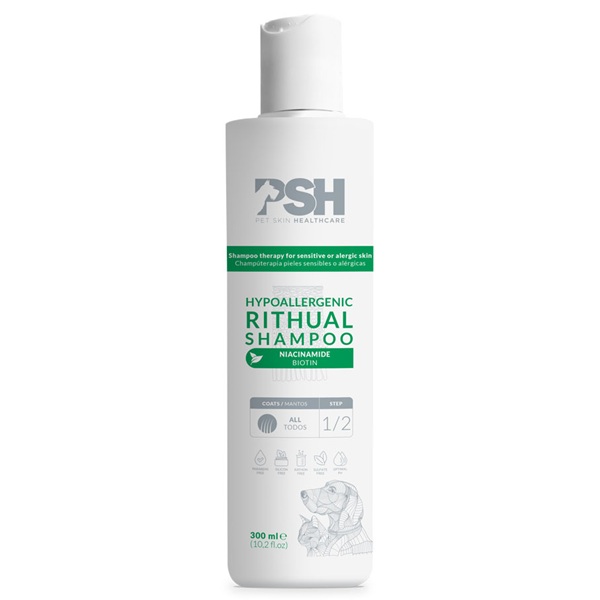 Hypoallergenic Rithual schampo från PSH Home är ett mycket milt, färdigblandat hundschampo som är anpassat för hundar med känslig hud. Hydrolyserad jäst och B-vitaminkomplex är de aktiva och fuktgivande ingredienserna, som ger den känsliga huden den omsorg den kan behöva. Innehåller även niacinamide och biotin som återfuktar och stärker huden och pälsen.