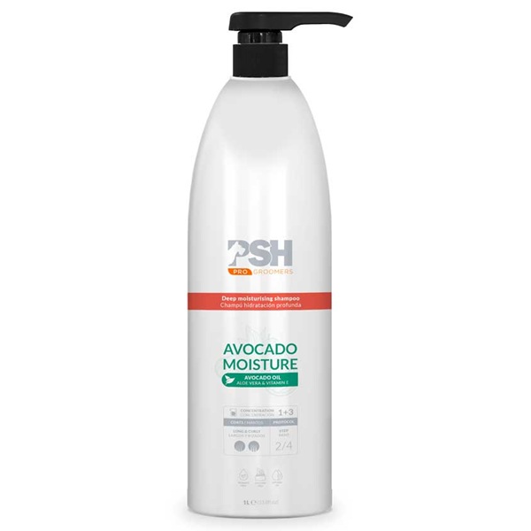 PSH Pro Groomers Avocado Moisture schampo är ett djupt återfuktande schampo med de aktiva ingredienserna avokadoolja, aloe vera och vitamin E. Schampot gör din hunds päls mjukare, mer återfuktad och hjälper till att både minska förekomsten av tovor och förebygga uppkomsten av nya tovor.