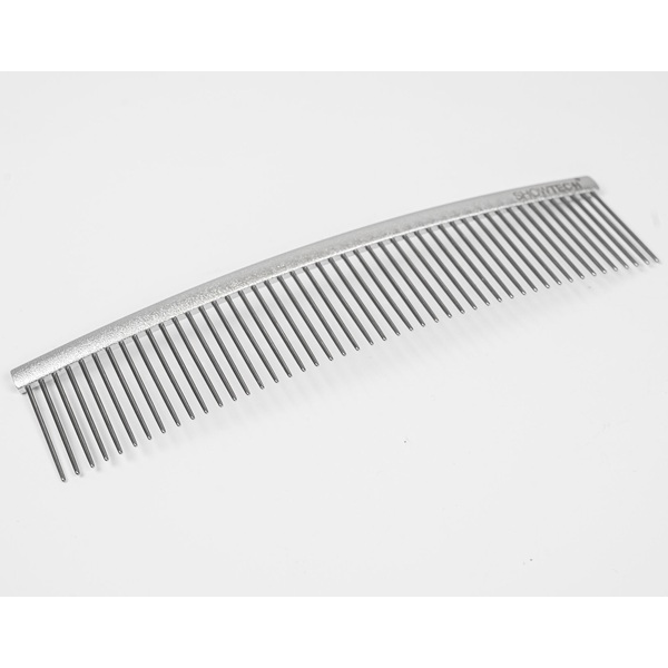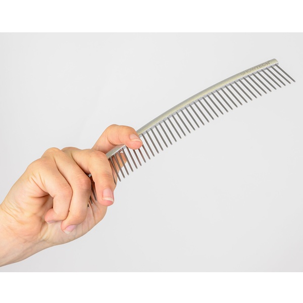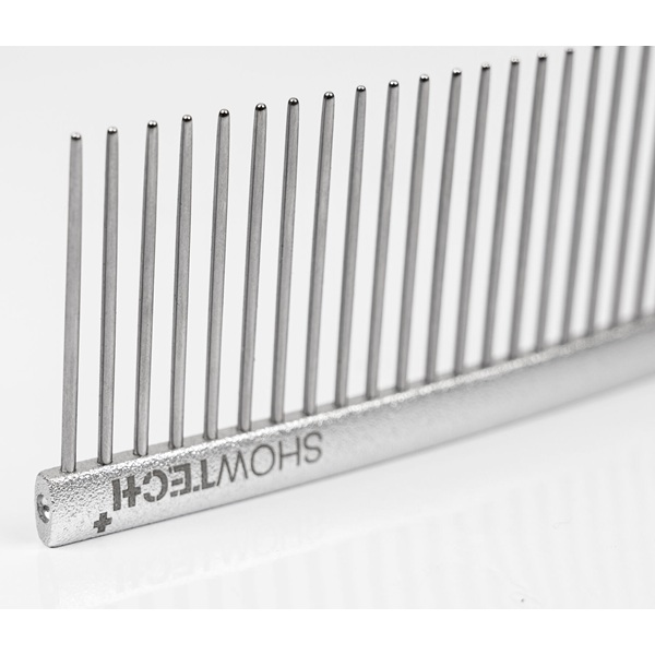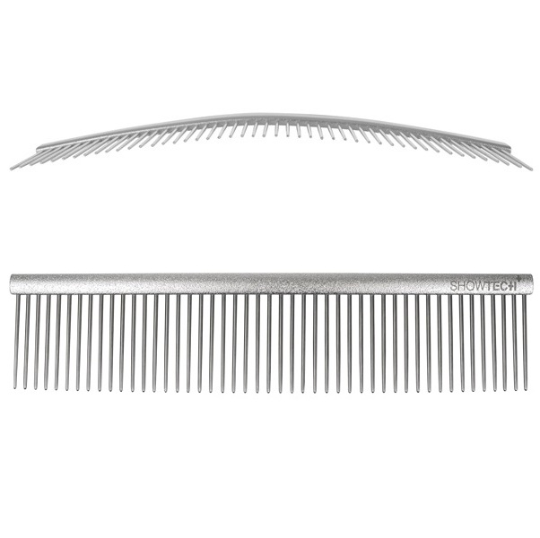 Show Tech+ Featherlight böjd kam är den ultimata kammen för proffs och medvetna hundägare när det kommer till styling, fluffning och klippning. Kammen är tillverkad av aluminium med polerade tänder i rostfritt stål. Den böjda formen följer enkelt hundens konturer och underlättar när man ska klippa rundade former.