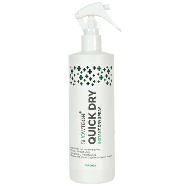 Show Tech+ Quick Dry är en effektiv fönspray som förkortar torktiden med upp till 40 % samtidigt som den ger värmeskydd. Den är perfekt att använda efter hundens bad för att minska torktiden och skydda pälsen mot slitage under föningen. Sprayen passar alla typer av pälsar och återfuktar utan att förändra strukturen eller göra pälsen mjuk.
