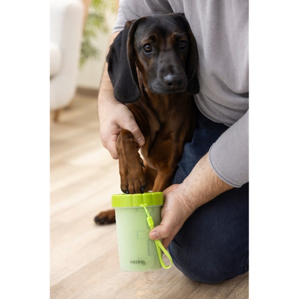 Tasstvätt med mjuk borst i TPR-gummi för enkel och skonsam rengöring av hundens tassar. Den mjuka silikonborsten masserar och rengör tassarna från smuts och grus. Tasstvätten är smidig och enkel att använda efter hundpromenaden.