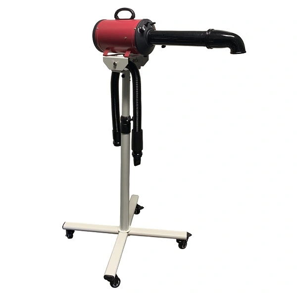 Effektiv hundfön med golvstativ. Två av stativets hjul är låsbara. Fönen levereras med både slang och rör. Röret är utmärkt att använda om du behöver använda båda händerna när du arbetar med hundens päls.