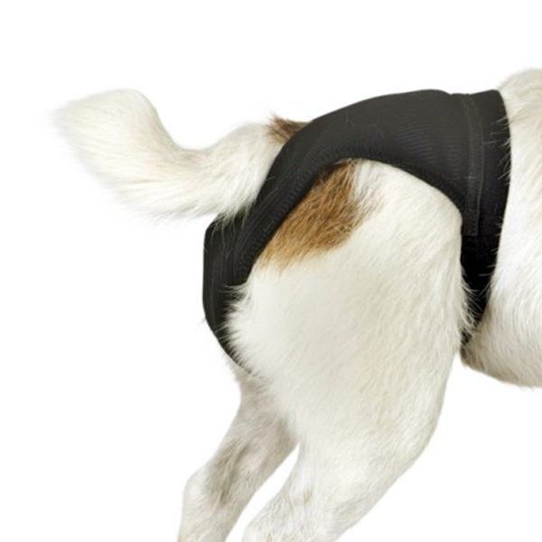 Svart tikskydd i mjuk, elastisk bomullstrikå. Praktiskt att använda under hundens löpperiod. Resårbandet i midjan har ett smidigt spänne som gör tikskyddet enkelt att sätta på och ta av. I byxan finns ficka för inlägg.