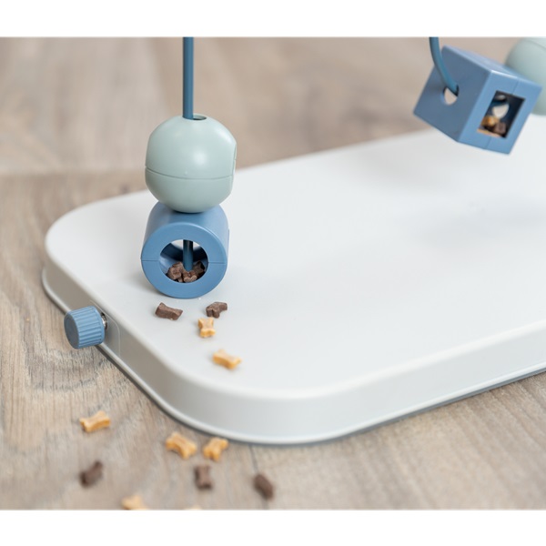 Det medföljer två bågar med olika svårighetsgrad, en vågformad och en rund samt fyra behållare. Lägg hundens favoritgodis eller foderkulor i behållarna. När hunden för behållarna längs bågen trillar godisbitarna ut och hunden belönas.