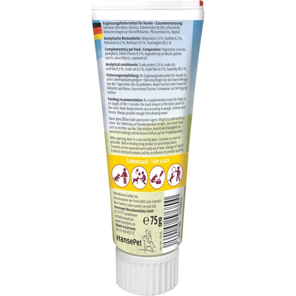 Lyxigt belöningsgodis av hög kvalitet för din hund. Tuben innehåller en smaklig delikatesspaté med Edamerost. Använd som belöning direkt ur tuben eller på valfritt sätt. Har du en kräsen hund går den bra att använda som topping på maten.